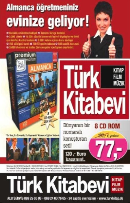 Hızlı, güvenirli Almanca öğrenimi icin Almanca Öğretmeniniz Evinize Geliyor!.. CD-Rom'lu Almanca Öğrenim Setine şimdi 197,00 euro yerine sadece 77,- Euro ödeyerek sahip olabilirsiniz!.. Bilgisayarınızda, karşınızda öğretmen varmış gibi Almanca öğrenmeye baslayacaksınız. Setimiz Windows Vista / Windows 2000 / 98 / XP sistemine de uyumludur.