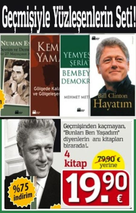 Gecmişi ile Hesaplaşanların Seti, 'Bunları ben yaşadım' diyenlerin anı kitaplarından oluşuyor. Anı kitaplari, bir nevi yaşayanların kendileri ile hesaplaşmasıdır. Herkesin alacağı dersler vardır, bu tür anı kitaplarından!.. Ilgiyle okuyacagınız 4 kitap birarada 79.90 euro yerine şimdi sadece 19.90 Euro!.. Bu fırsatı kaçırmayın!.. 4 KITAP TOPLAM 3.206 SAYFA!