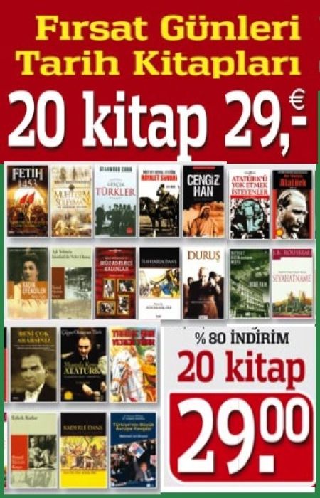 1) Fetih 1453 / Ya Istanbul Beni Alacak, Ya Ben Istanbul'u / Hüseyin Tekinoğlu 2) Muhteşem Süleyman ve Hürrem Sultan / Yavuz Bahadıroglu 3) Gerçek Türkler / Stanwood Cobb 4) Atilla / Michael Curtes Ford 5) Güney Afrika'da Osmanlılar / Ahmet Ucar 6) Doria ve Barbaros / Jurien de La Graviere 7) Duruş / Atatürk'un Duruşu, Tavır ve Hareketleri / Mustafa Tarakçı 8) Atatürk'ü Yok Etmek Isteyenler / G.C. Balci 9) Çılgın Olmayan Türk Mustafa Kemal Atatürk / M. Yüksel Özbek 10) Hayalet Süvari Mustafa Kemal Atatürk / Ray Brock 11) Her Cephede Savaştık / Cengiz Özkarabekir 12) Numaracı Cumhuriyetciler / Orhan Koloğlu 13) Türkiye'nin Büyük Avrupa Kavgası / Mehmet Ali Birand 14) Matbuat Basın Derken.. Medya / Bedii Faik 15) Milli Mücadele ve Mücadeleci Kadınlar / Mustafa Tarakçı 16) Kızlaragaci Piçi / Resad Ekrem Koçu 17) Tuna Nehri Akmam Diyor / Rupert Furneaux 18) Tarihimizle Hesaplaşmak / Mustafa Armagan 19) Ilahlarla Dans / Prof. Dr. Mim Kemal Öke 20) Kaderle Dans / Prof. Dr. Mim Kemal Öke 21) Kanuni Sultan Süleyman Posteri (Hediye) 22) Bir sonra ki Alisverişinizde kullanmak üzere 10,- Euro degerinde Hediye Kuponu (Gutschein) gönderiyoruz. Not: Kampanyamızda tükenen kitapların yerine aynı değerde başka tarih kitabı ilave edilecektir. Stoklarımız tükenmeden siparişinizi vermekte acele ediniz.